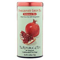 Per Republic of Tea: “The glistening crimson seeds of the pomegranate are juicy and sweet. Crisp, fresh China green tea creates an ideal base for this ruby-hued blend. Sip your way to good health with this green tea blend.”