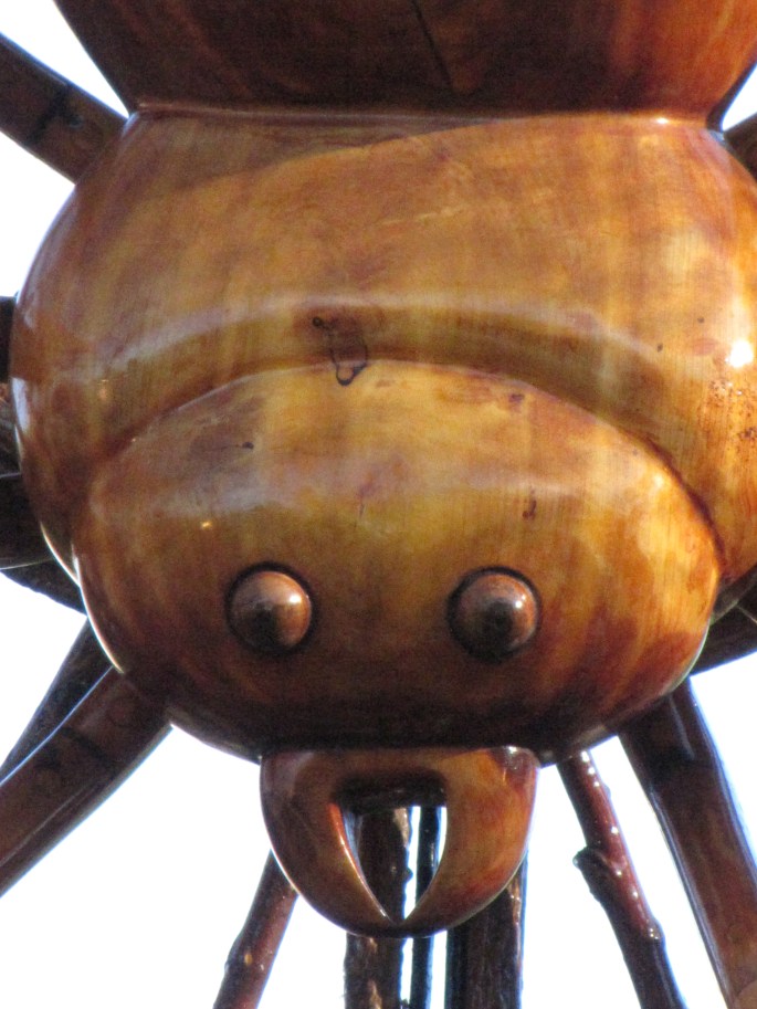 The DBG.org site described the exhibit as follows: David Rogers’ Big Bugs was on display throughout the Garden and provided a look at insect predators, pollinators and beneficial critters. The 11 enormous, whimsical bugs created quite a buzz! Sculptor David Rogers has carefully created these creatures from fallen or found wood, cut saplings, twigs, raw branches, twine, bark and other natural materials. The sculptures weighed from 300 to 1,200 pounds and ranged from seven feet to 25 feet long.