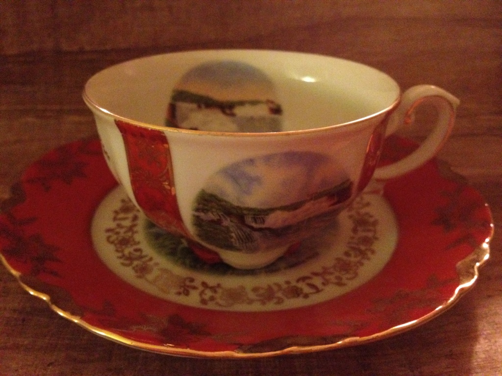 The second teacup is a very special one. My husband bought this teacup for me for our anniversary while we were out antique shopping. It has Niagra Falls on it which is where we went on our honeymoon many a year ago.