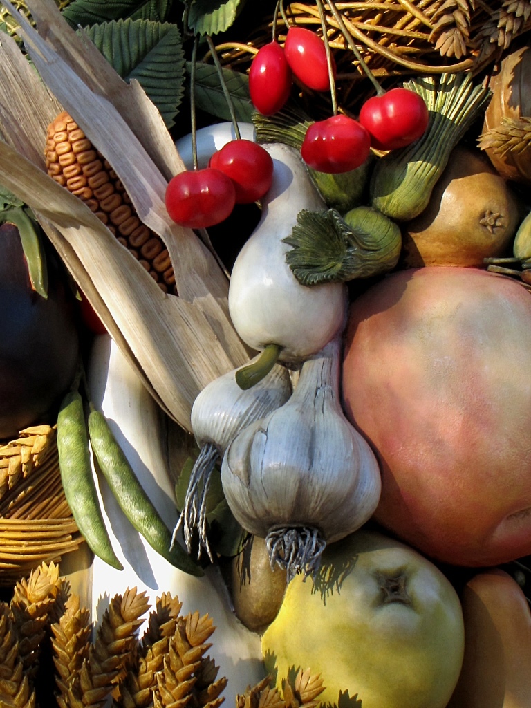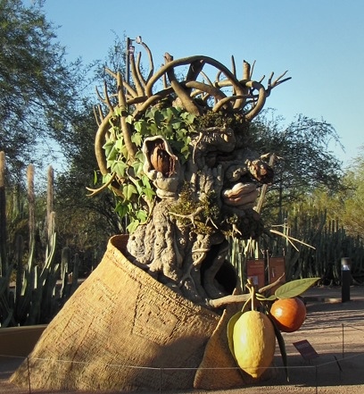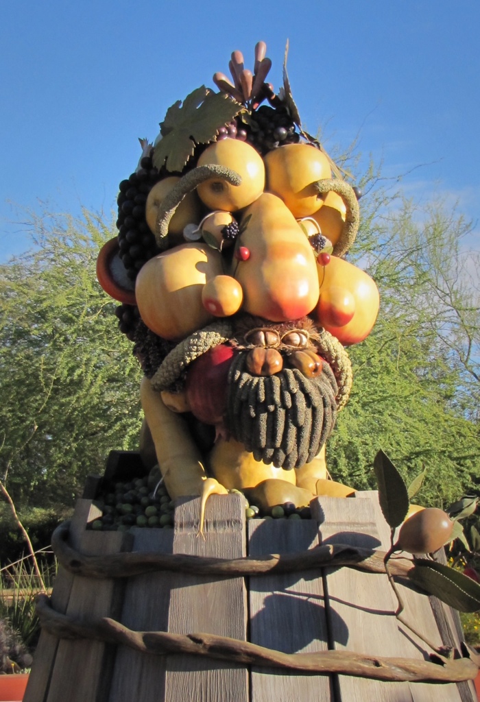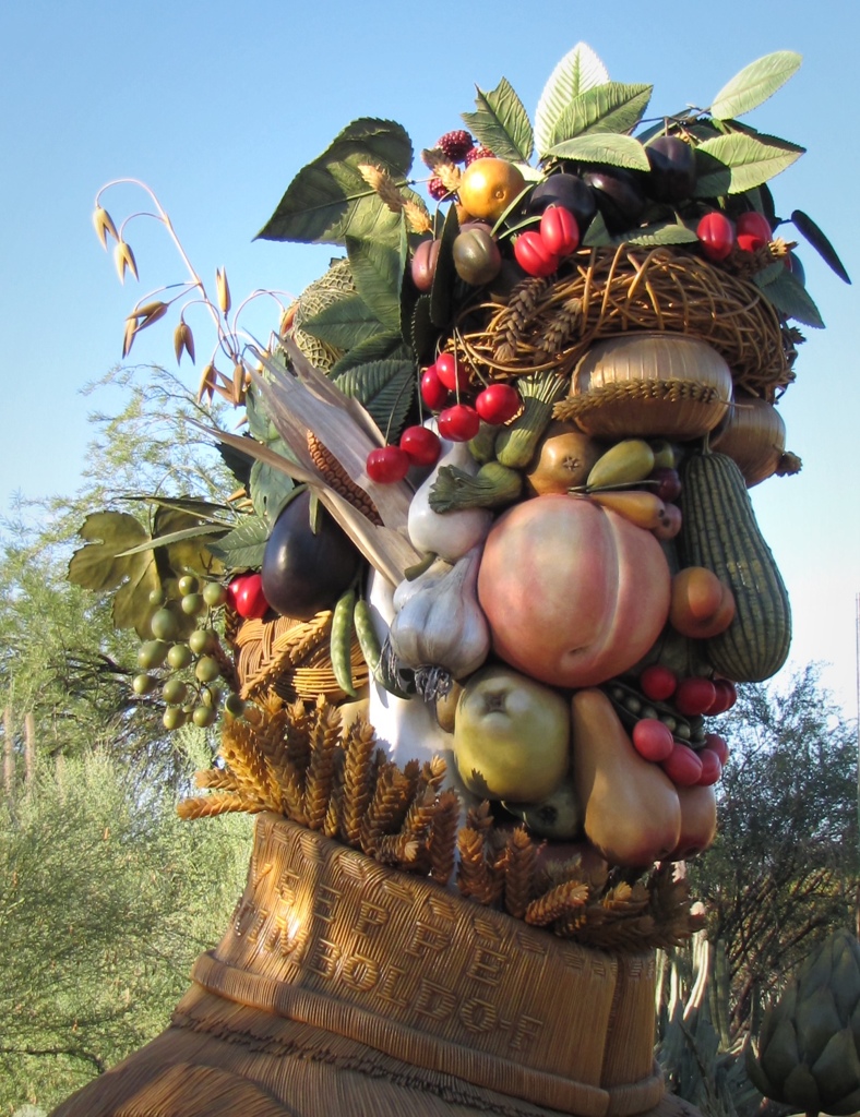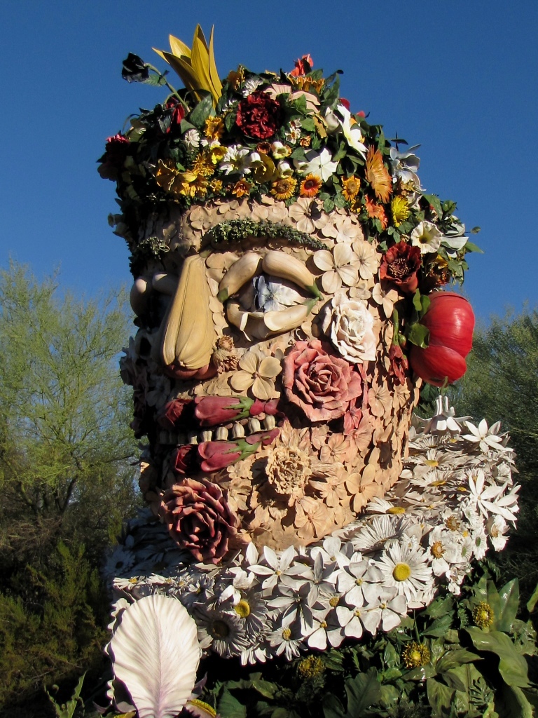The gardens website describes the exhibit as: The Four Seasons are four monumental, earthy and exuberant sculptures that will delight your eyes. The sculptures are inspired by Italian Renaissance artist Giuseppe Arcimboldo’s painting series The Four Seasons. Arcimboldo’s imaginative portraits were whimsical, puzzle-like paintings composed of fruits, vegetables, flowers and related objects.