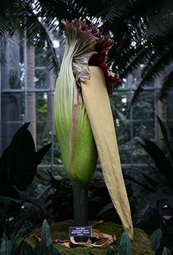 🙂 Every morning this week I checked out the live webcam for the Titan Arum – Corpse Flower – blooming at the D.C. Arboretum. This flower is a 250-pound Indonesian giant that gives off the scent of rotting flesh when it’s ready to attract beetles and other pollinators — on its own unpredictable and irregular cycle. The first flower was at bloom – which apparently last 24 to 48 hours. Second photographs was of the collapsing corpse flower.