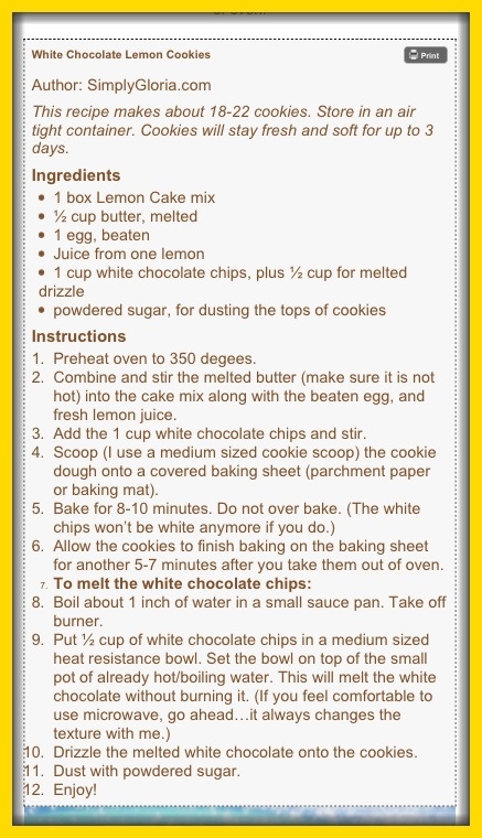 I made white chocolate lemon cookies. The turned out pretty good. Below is the recipe if you like a nice lemon dessert.