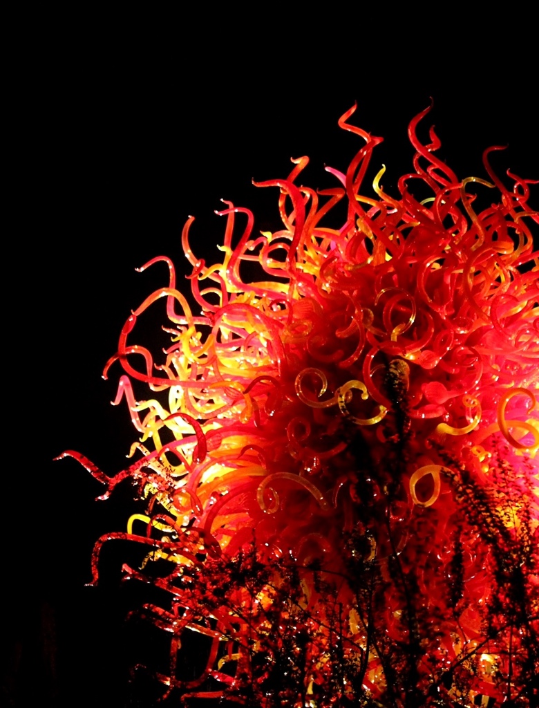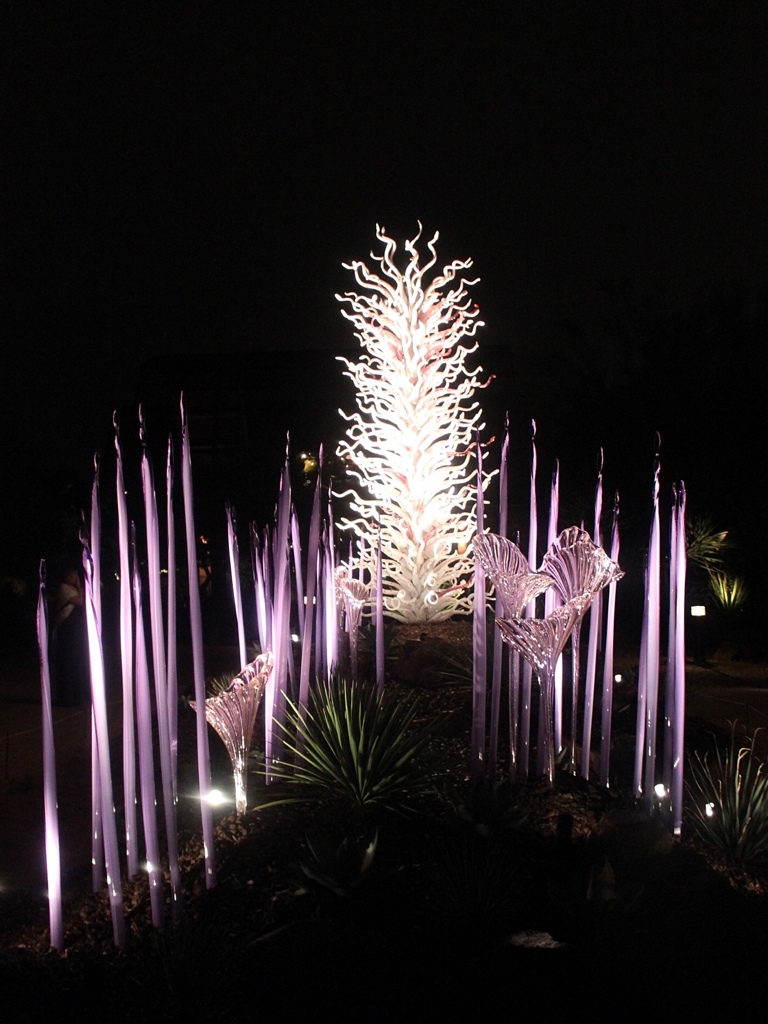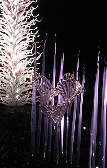 I love the Chihuly pieces even more set against the night sky! My favorite is the pink and white polka dotted piece. Nice write-up! Love the photos.