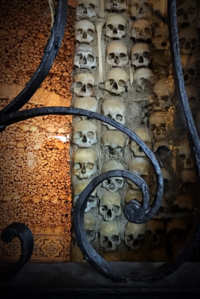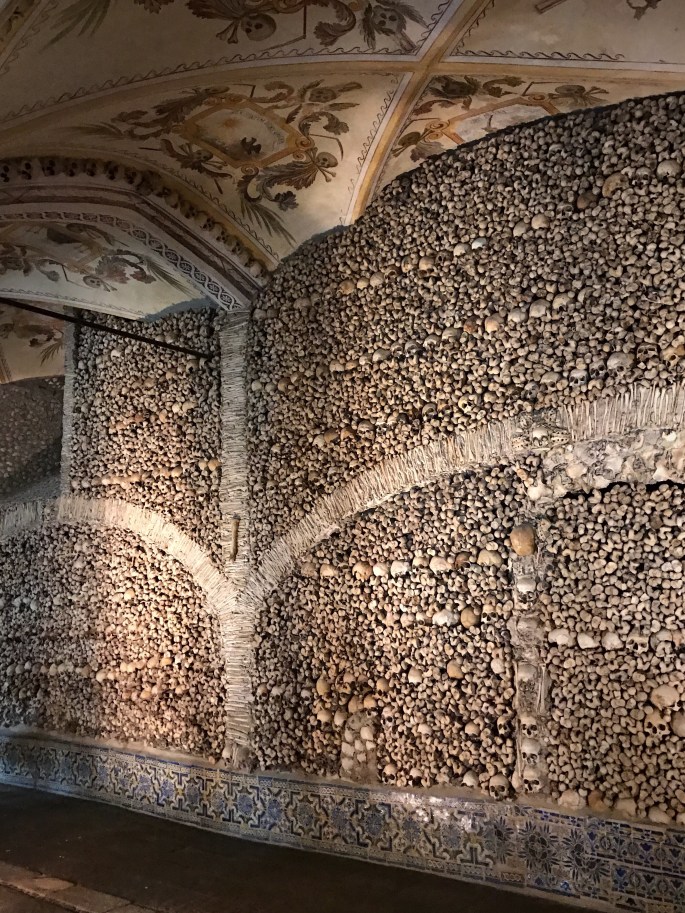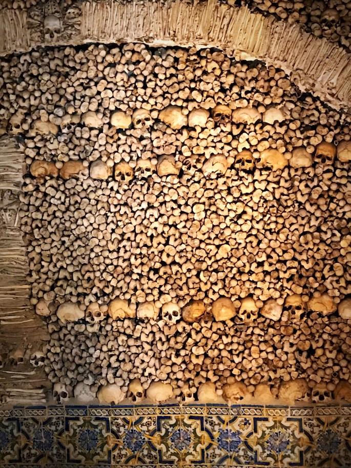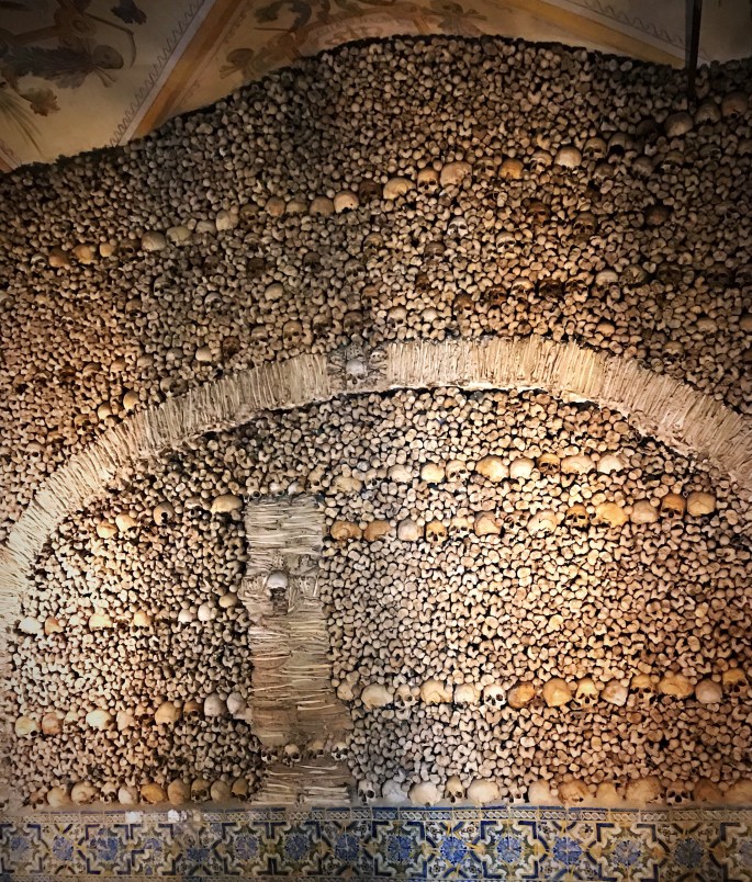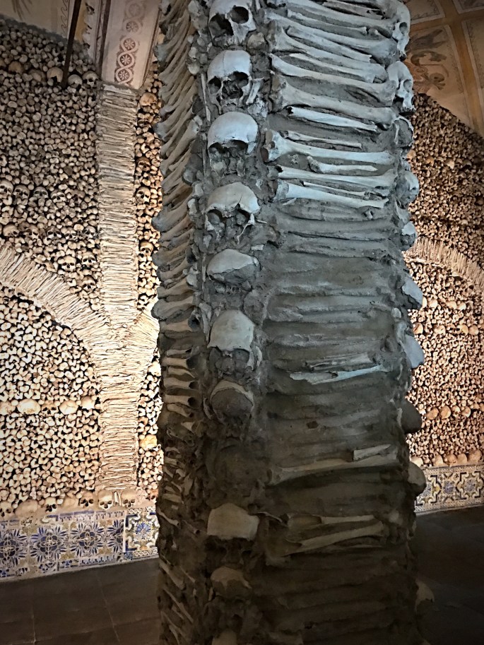 We arrived at Evora, one of Portugal’s beautifully preserved Medieval towns. Inside the towns 14th century walls you find an elaborate cathedral and cloisters, columns of a Roman Temple and the San Francisco Church and Ossuary Chapel. The Chapel was decorated with thousands of human bones and skulls.