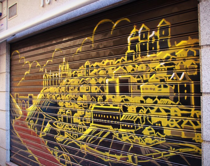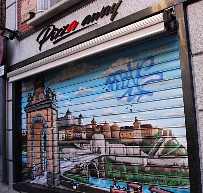 Today I thought I would also focus on the street art that we saw as we walked thru Toledo. it was so much fun to see all the shop doors in the early morning, still closed, and then able to see the artwork on the security doors.