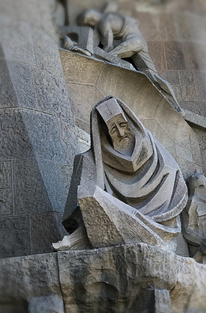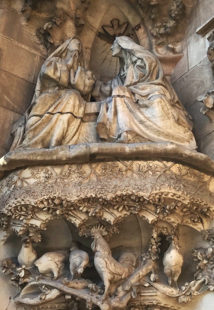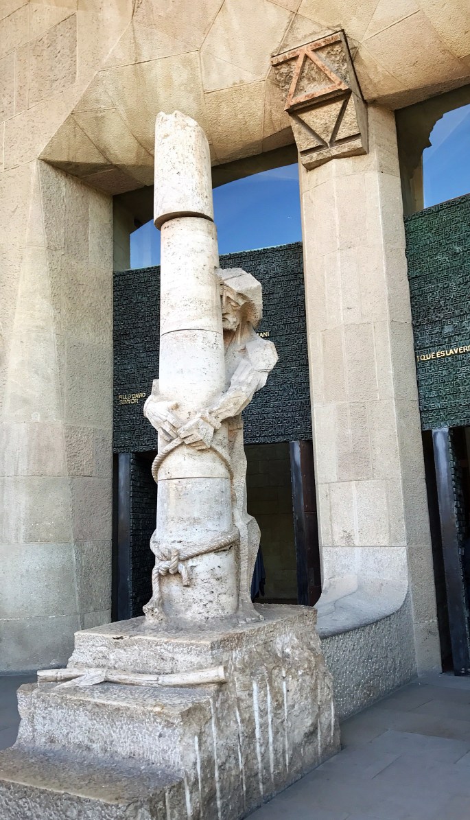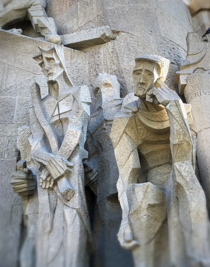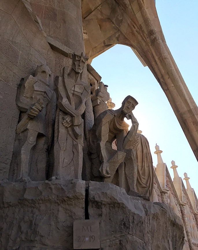 The sculptures on the outside, designed by Gaudí, are different depending on the side of the building you are viewing. Some look an old style and others are blocky and artsy…